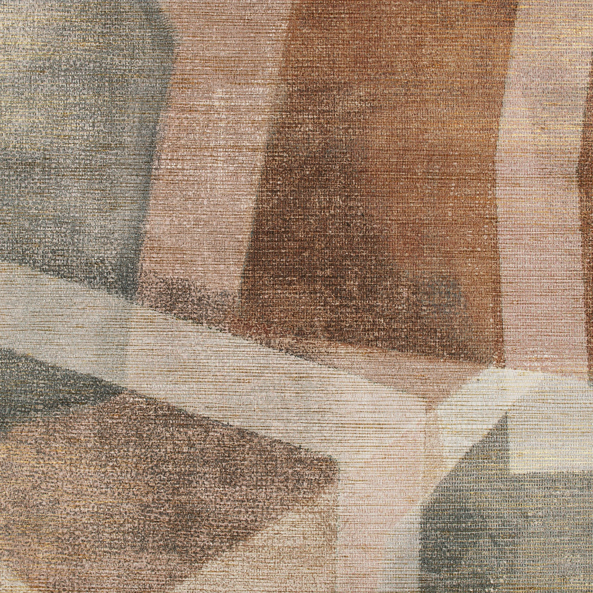 A fusion of rustic and lustrous elements; an arresting, painterly geometric is bold in pattern, colour, and texture, printed on natural, woven raffia that has been delicately positioned on a glimmering foil background.