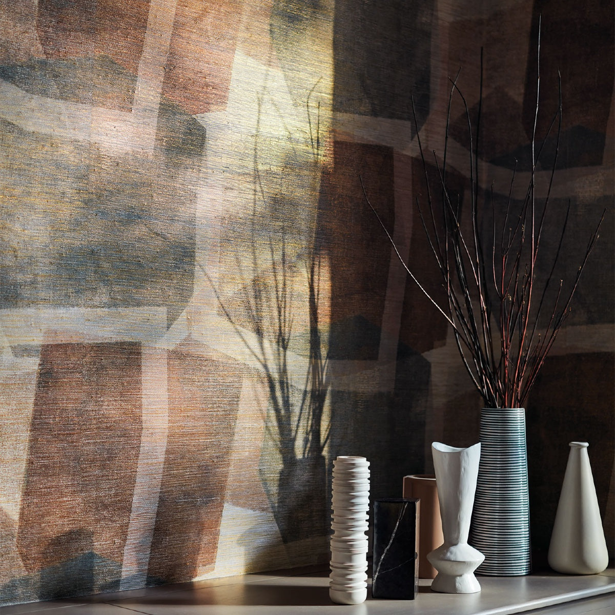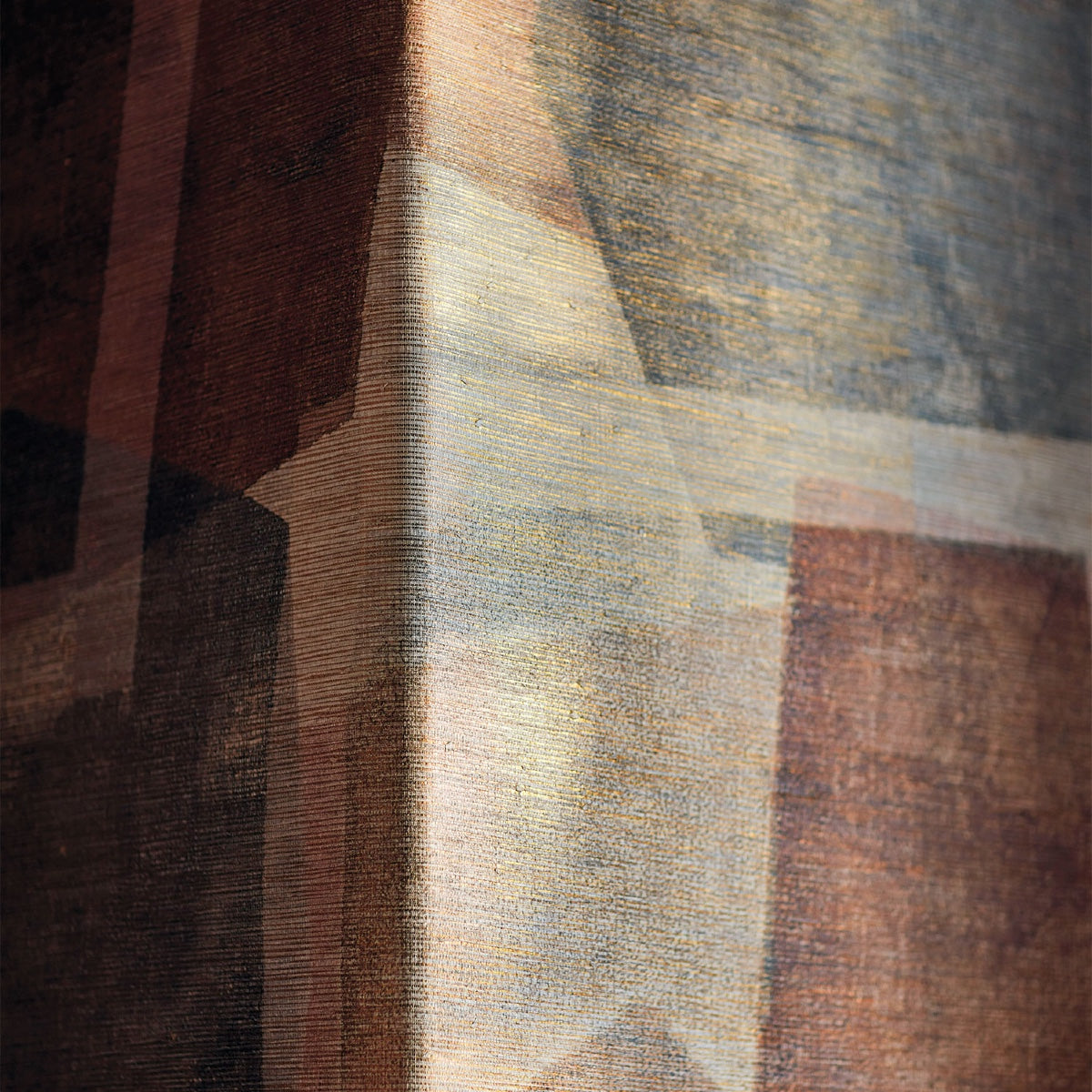 A fusion of rustic and lustrous elements; an arresting, painterly geometric is bold in pattern, colour, and texture, printed on natural, woven raffia that has been delicately positioned on a glimmering foil background.